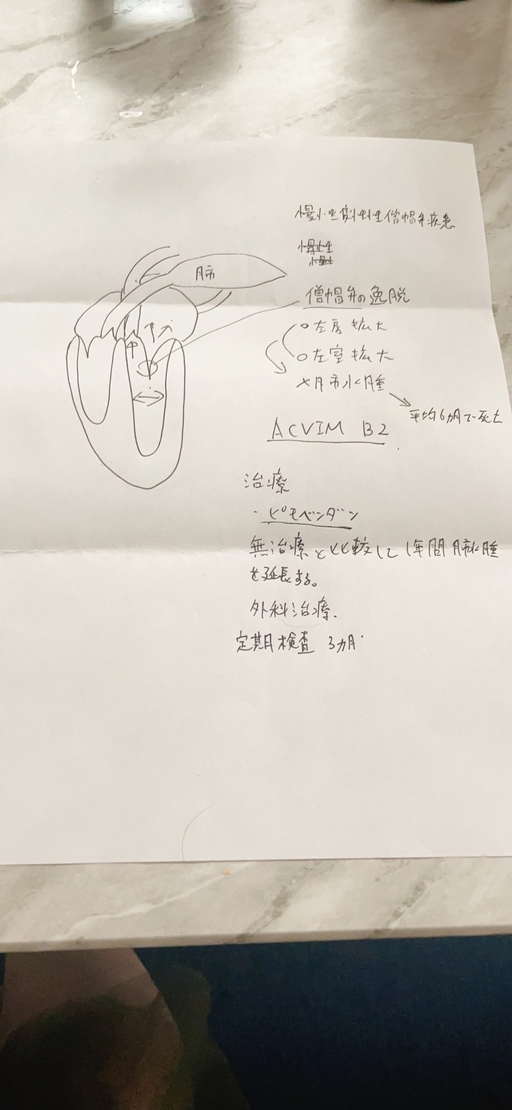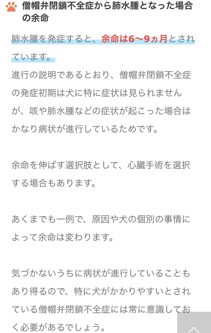 今はステージB2ですが弁膜を支える腱が何本も切れており、近い将来肺水腫になる可能性が高く、そうなれば平均6ヶ月短くて半日で亡くなってしまうケースもあると言われました。