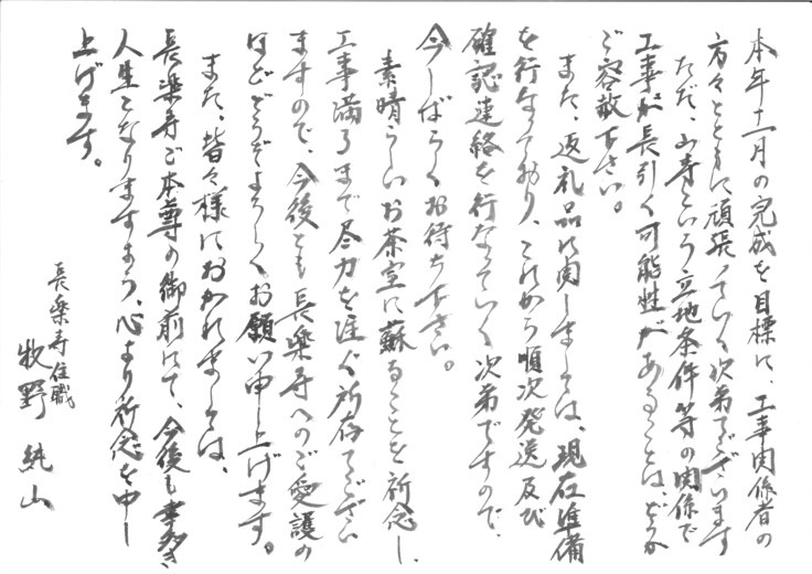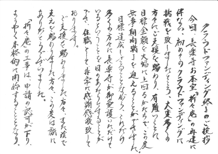 そして、支援者の一人一人が1200年の歴史あるお寺を私達が支えたのだという思いを持っていただければ、それが長楽寺にとっての大きな財産になると確信しております。