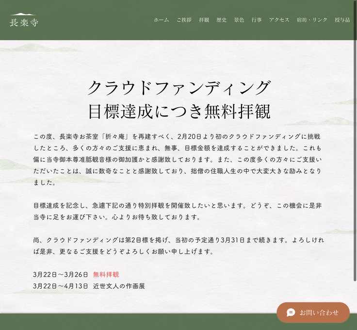 【達成御礼】目標達成を記念して、無料拝観を開催致します。|3月26日まで