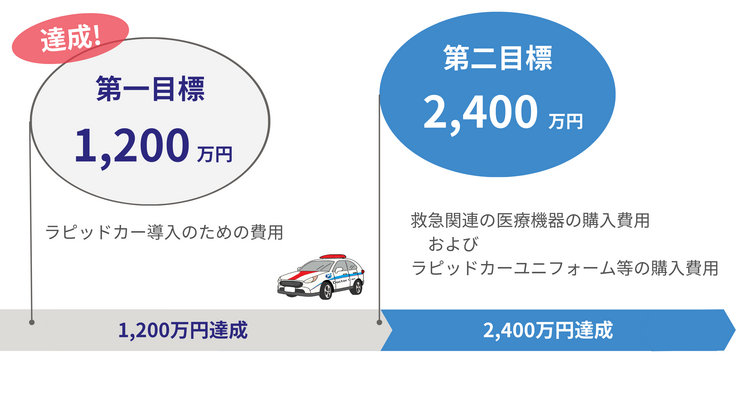今後皆様からいただくご寄付をもとにラピッドカーをより有効に活用できるよう、救急関連の医療機器の購入、およびラピッドカーユニフォーム等の購入に要する金額として、ネクストゴールを2,400万円と設定いたしました。