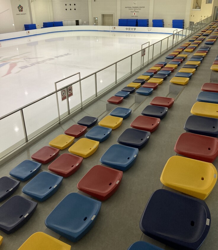 これは、イスの色を変えることで、多くの「お客様」を演出しているのです!!このリンクで練習する選手たちは常に多くのお客様が観客席にいることを想定し、実践さながらの練習に励んでいます。