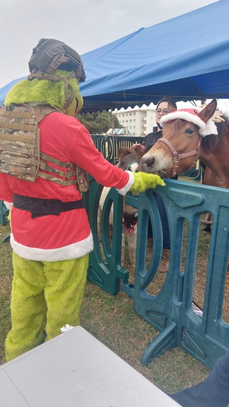 トラックでの移動や基地に入るためのセキュリティチェックなどは大変ですが、ボランティアさんたちの明るい笑顔のおかげで毎回楽しい経験をさせていただいております。今回は残念ながら終始小雨でしたが、訪れた多くの子どもたちの笑顔にポニーたちもたくさん癒されていました。