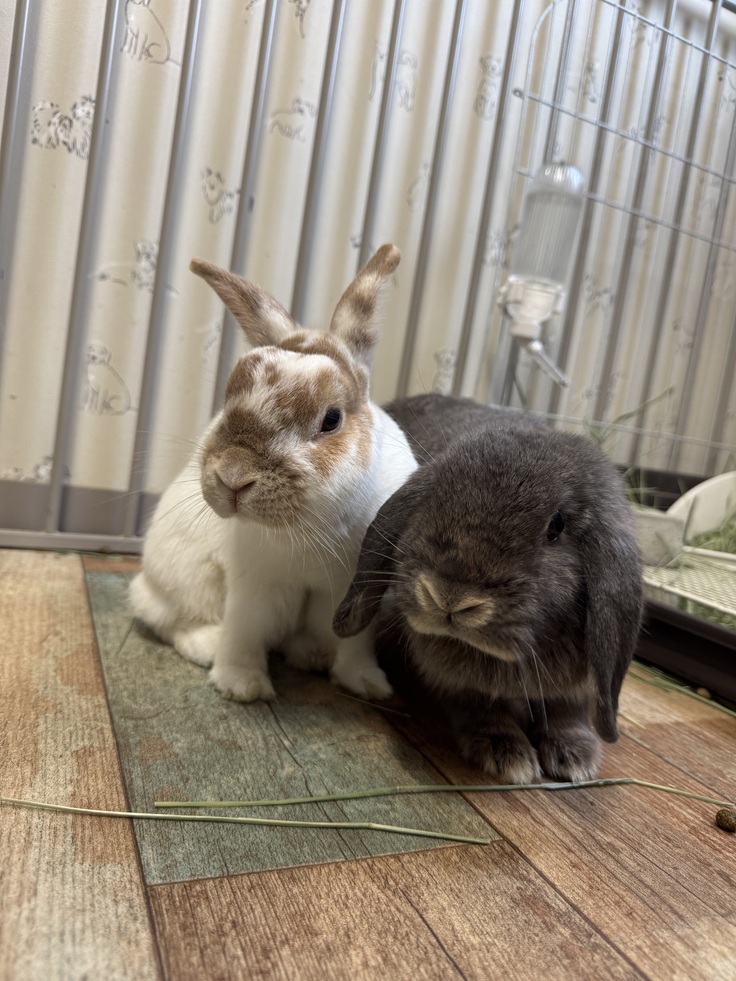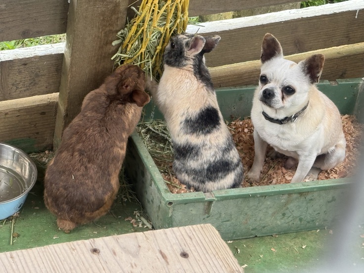 また、小動物たちも元気に過ごしています。高齢のうさぎラビちゃんは視力がほとんどなくなりましたが、すずと仲良く同居してます。