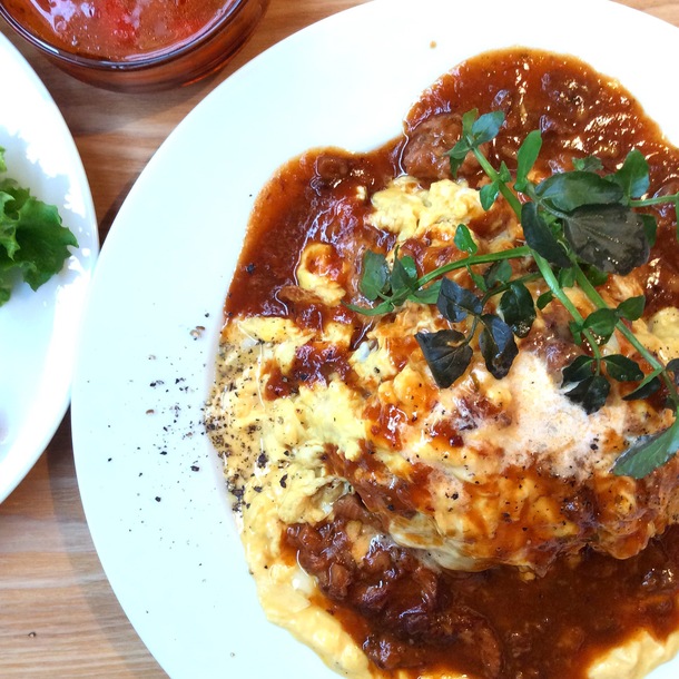 江連農園さんの元気な玉子をふわとろにして、栃木和牛を贅沢に使って煮込んだデミグラスをかけました。