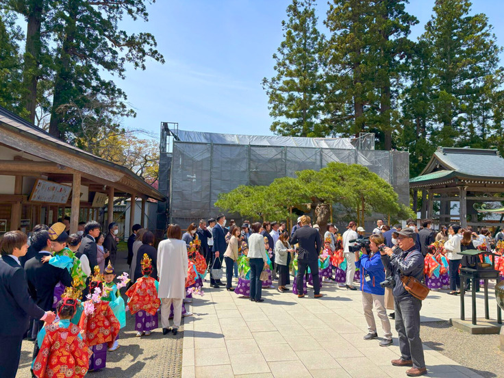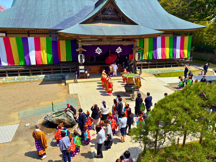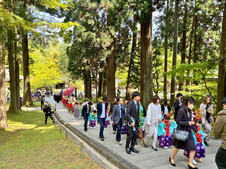 本日は天候にも恵まれ、子どもたちの華やかな衣装と舞い散る桜が、美しい調和を見せていました。そして、山々の緑も日ごとに色を増し、平泉の春を一層感じさせてくれます。