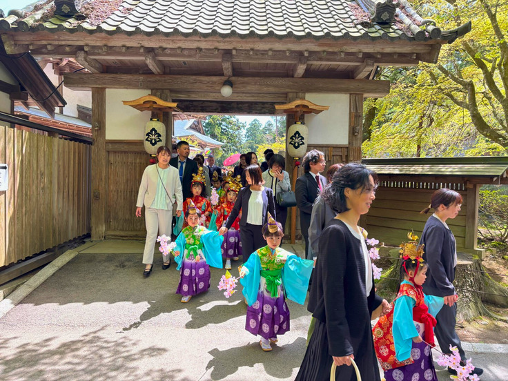 法要に続いて、桜の花を手にした稚児たちが色鮮やかな平安装束で登場しました。