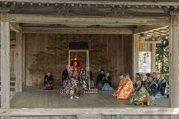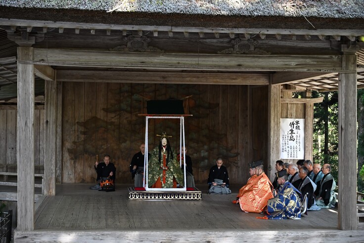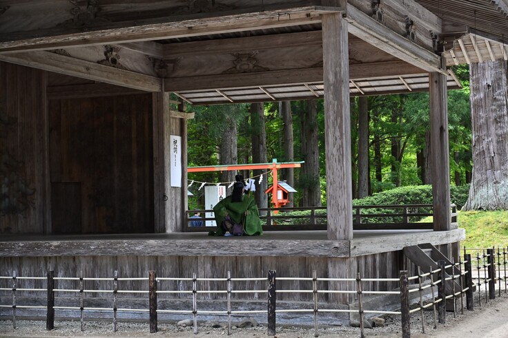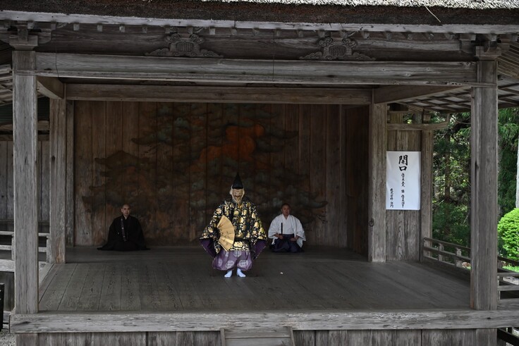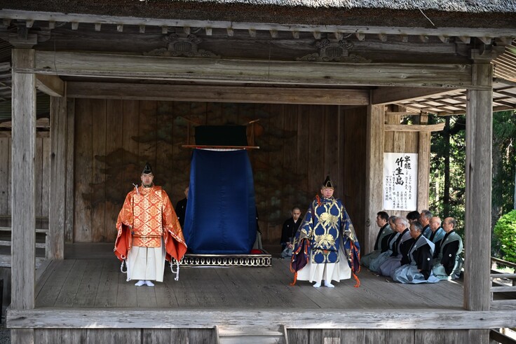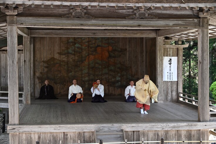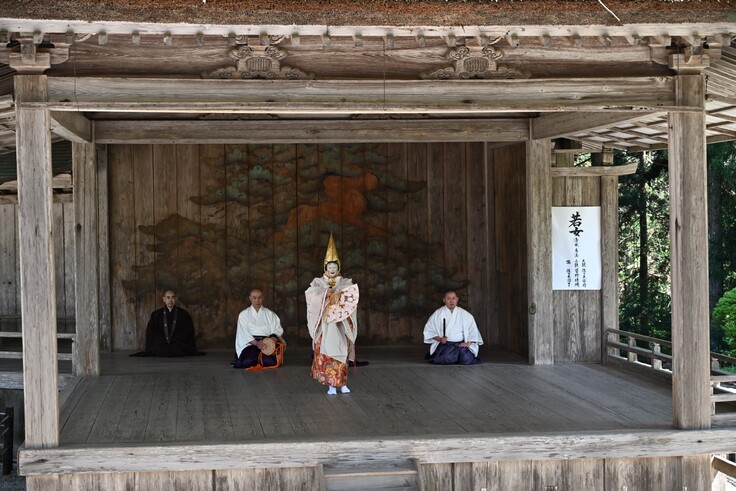 当山では、毎年5月4日・5日に白山神社の能楽堂にて、古実式三番と御神事能を奉納しております。