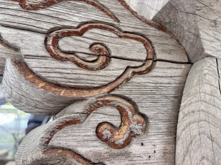 また、妻飾りに施された桐紋の近くをよく観察すると、装飾部分にわずかに赤みが見える箇所がありました。
