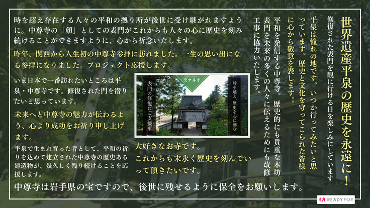 クラウドファンディングのページだけでなく、境内でも直接あたたかいお言葉を頂戴しており、皆さまのお気持ちに改めて深く感謝申し上げます。