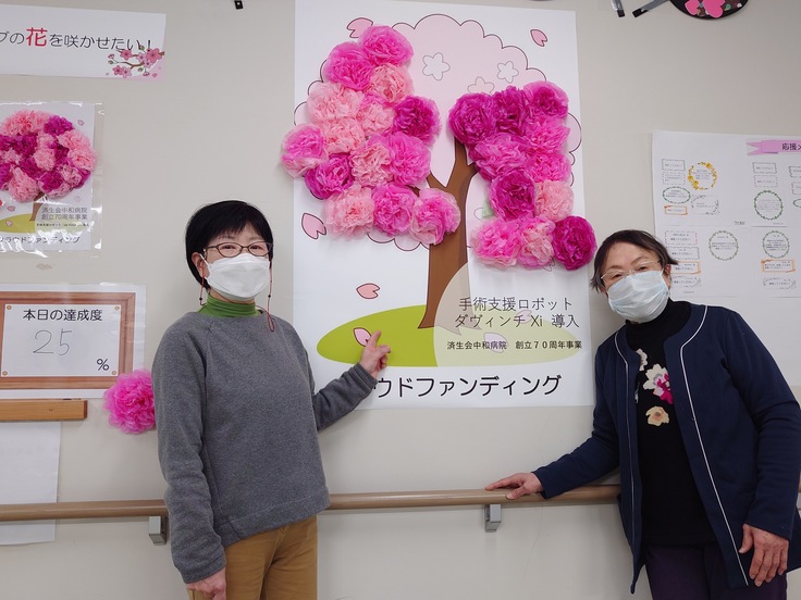 病院内のクラウドファンディングのさくらの木は徐々にお花を増やしております♪
