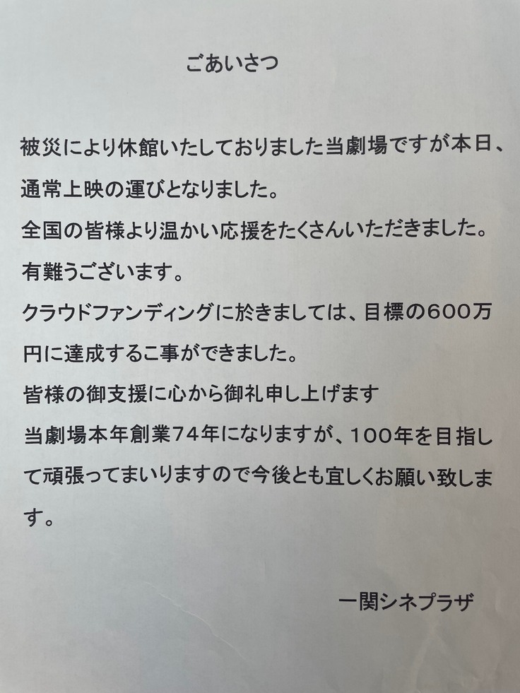 感謝のお手紙&一関シネプラザ招待券コース 5,000円