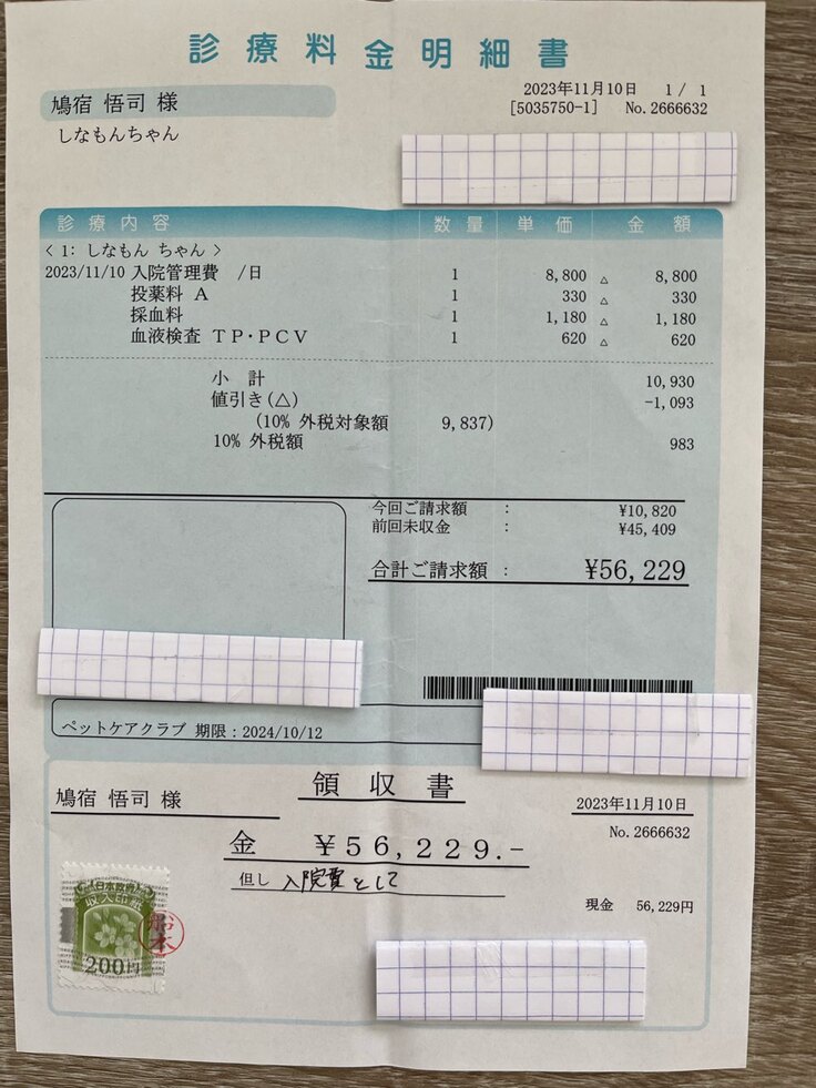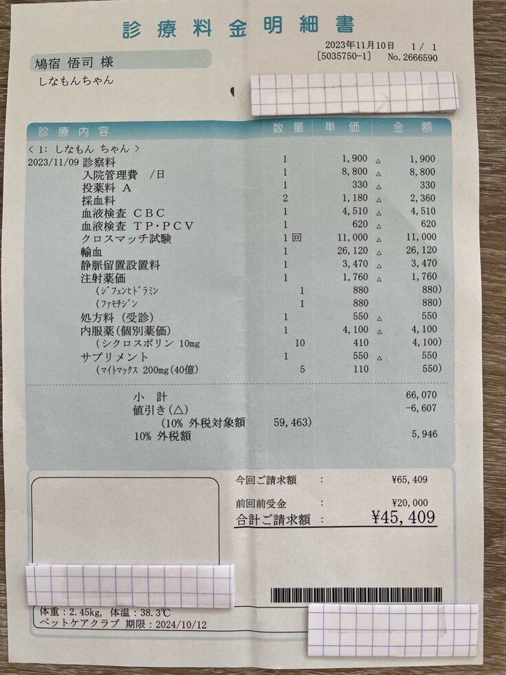 ・2日分の入院費・3回分の採血代・2回の血液検査代(貧血の数値のみの測定)