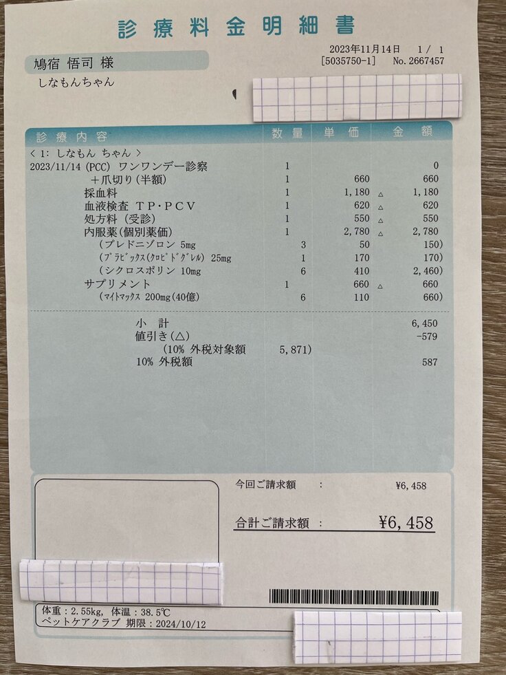 ・採血代・血液検査(貧血の数値のみを測定)・薬代