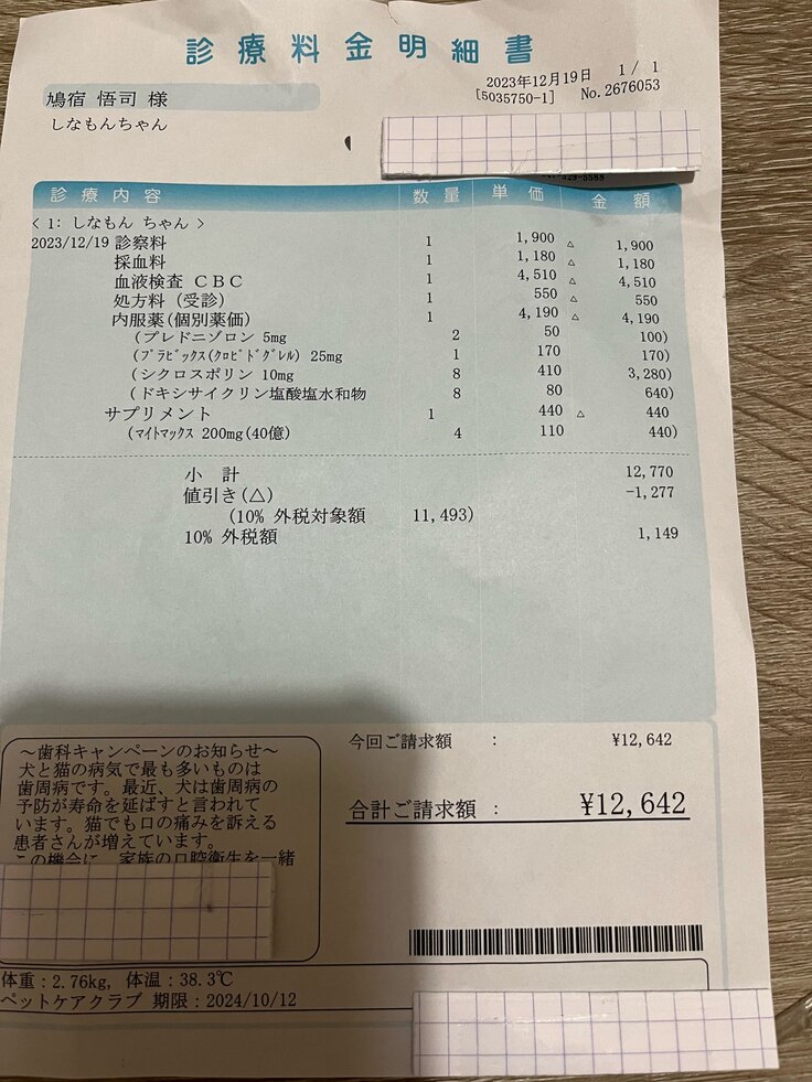 12月19日(土曜)の診察代です。