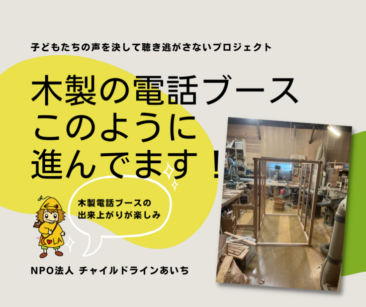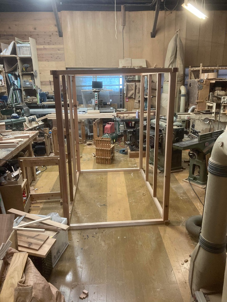 先週、木製の電話ブースの提案をしていただいた設計士の福田さんから、「電話ブースの骨組みができました。この骨組みの柱間に杉板を落とし込んでいきます」と、連絡が入りました。