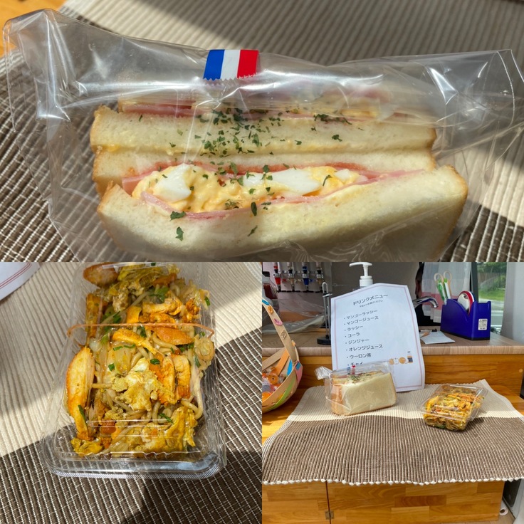 飲食店の駐車場、飲食店内のスペースをお借りして、サンドイッチ、焼きそば、カレーピラフ、ドリンクをお配りしました。