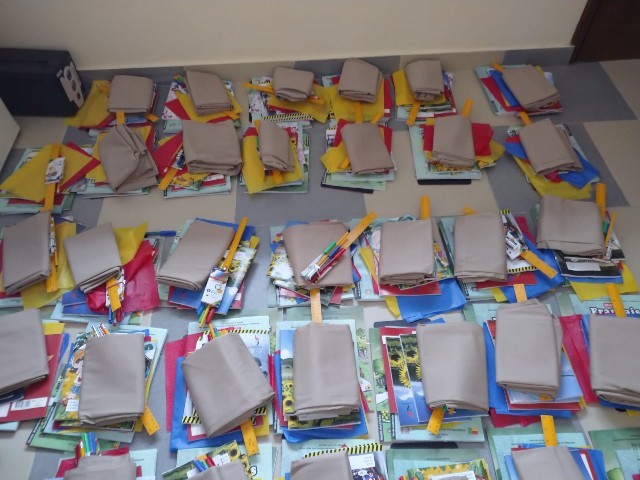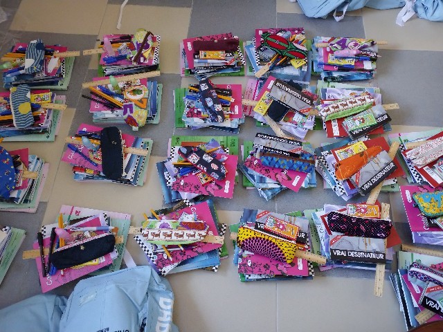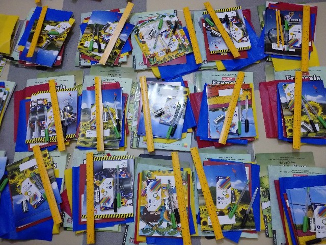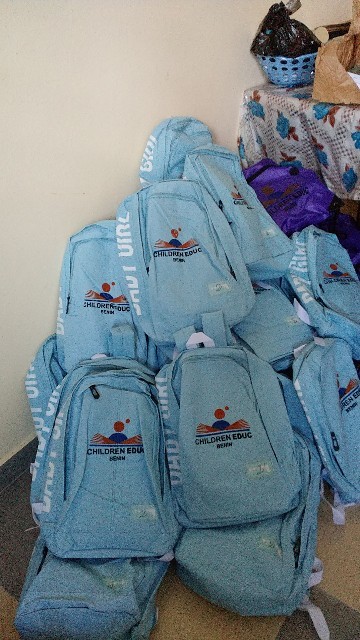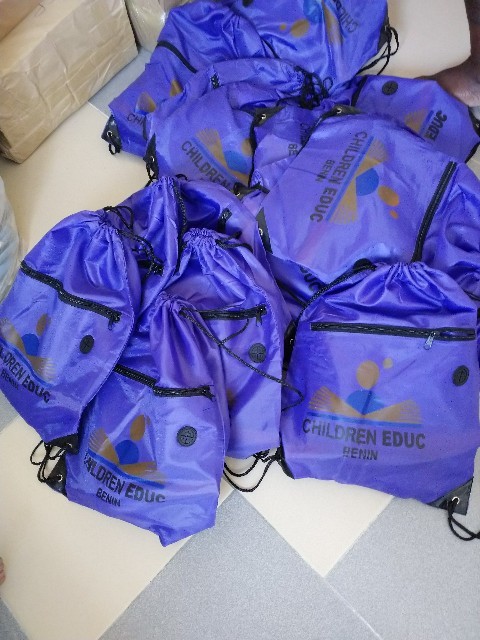 教材をまとめ終わったら、いよいよそれをバッグに詰めていきました。水色のバッグにつきましては、すでにお知らせした通りですが、紫色のナップサックは、数日前に急遽買い足したものです。私の友人や親族から個人的にお金をいただいたり、クラリスの伝手で、ベナン国内の団体から教材が大量に届いたということもあり、バッグが足りなくなったのです。