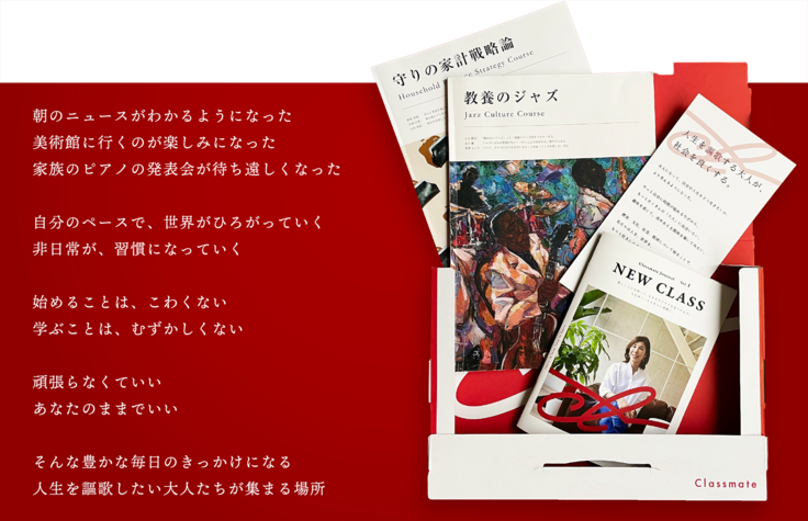 Classmate(クラスメイト)は、大人が「学び」をきっかけに繋がりと豊かな生活を育む オンラインの生涯学習コミュニティです。