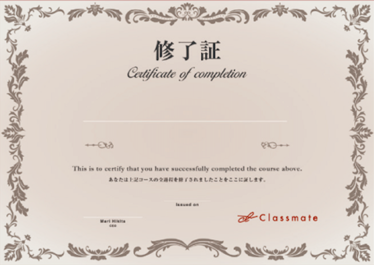 コースを修了すると、新しい知識を学んで世界を広げた成果が目に見える、自分だけのオリジナル修了証がもらえます。コースを修了した方のみが受験可能な資格などもご用意しています。※画像はイメージです