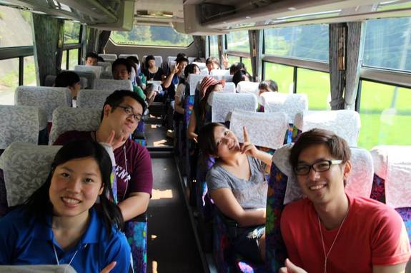産業体験のグループ(農業のお手伝い4件、漁業のお手伝い1件、NPO(お弁当づくり)のお手伝い1件)に別れ、早速バスで各場所へ出発!