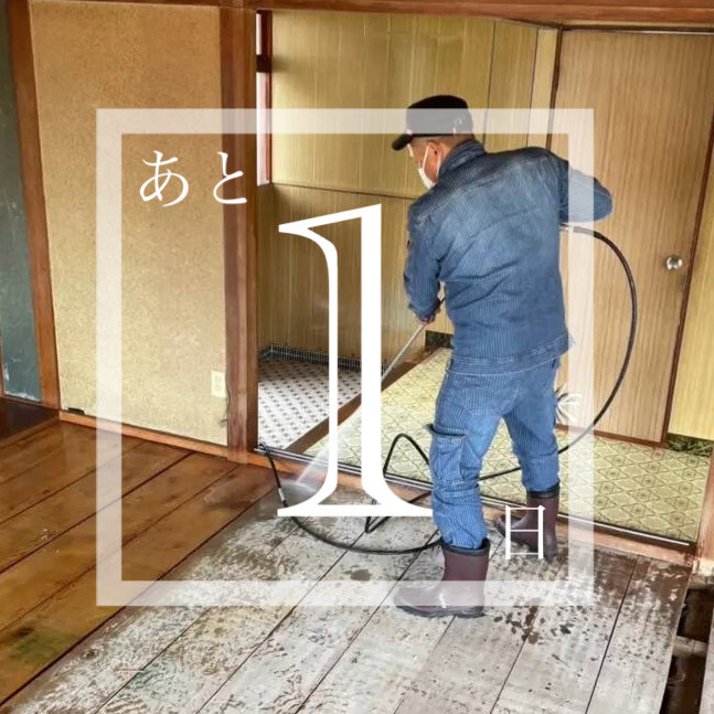 写真:床の汚れを高圧洗浄機で洗浄しています