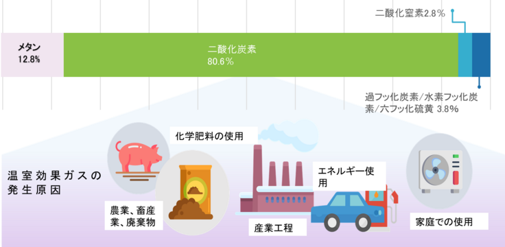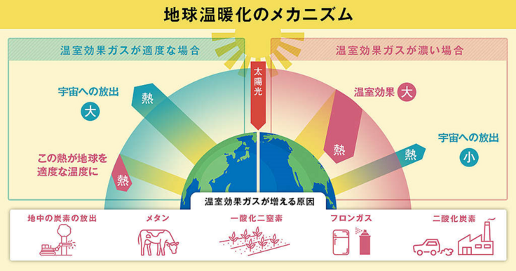 人間の活動によって、大量の温室効果ガスが大気中に放出され、地球の気温が上昇し続け、気候や生物など自然界のバランスを崩している現象を「地球温暖化」と呼びます。