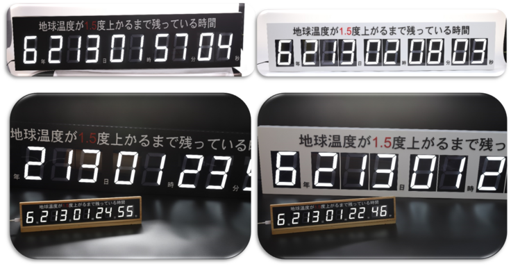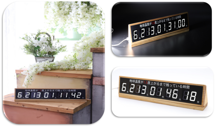 地球温暖化や気候変動により産業革命以前と比べて、地球の平均温度が1.5℃上昇するまで残っている時間をリアルタイムで表示するデジタル時計です。温室効果ガスの排出による気候変動の進行を視覚化し、人々に危機意識と緊急性を伝えることを目的としています。