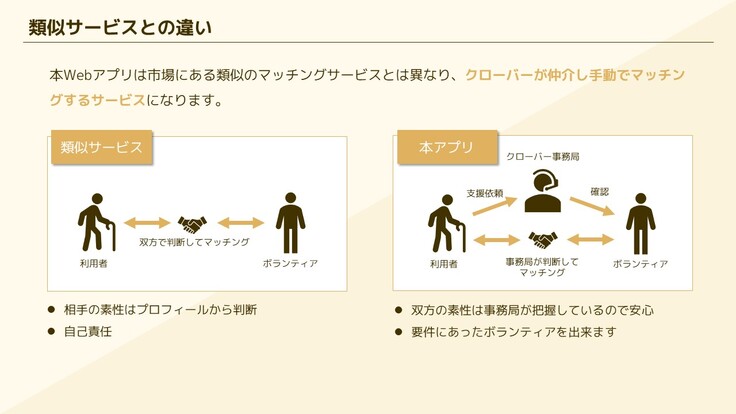 現状のコーディネーターが、もし体調不良などで活動不可になれば、クローバーの活動自体がストップしてしまいます。管理者側が複数人でシェアしながら活動を継続したい。そう願って、手作業に頼らずデジタルの力で解決できればと思い、アプリ導入プロジェクトを計画するに至りました。