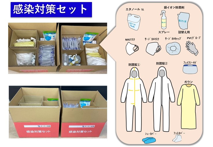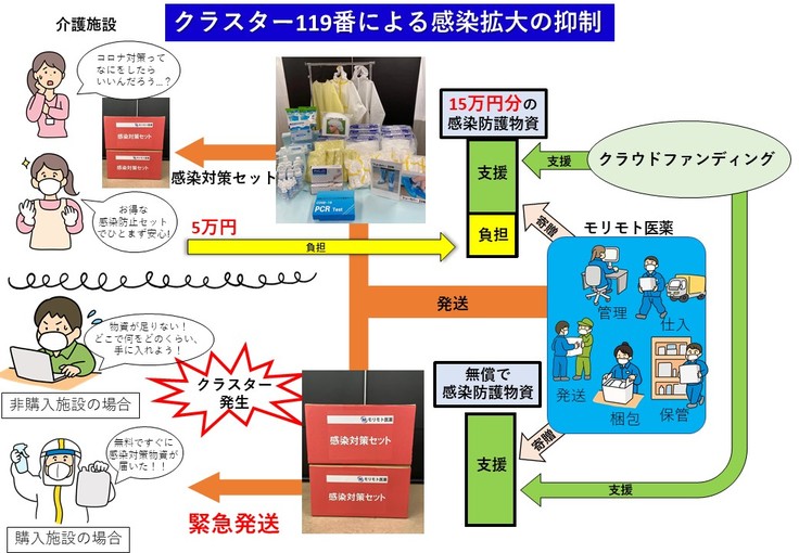モリモト医薬株式会社が、感染防護具等の仕入れを行い、「介護施設クラスター119番」をオンラインショップで販売し発送するなど運営を行う。