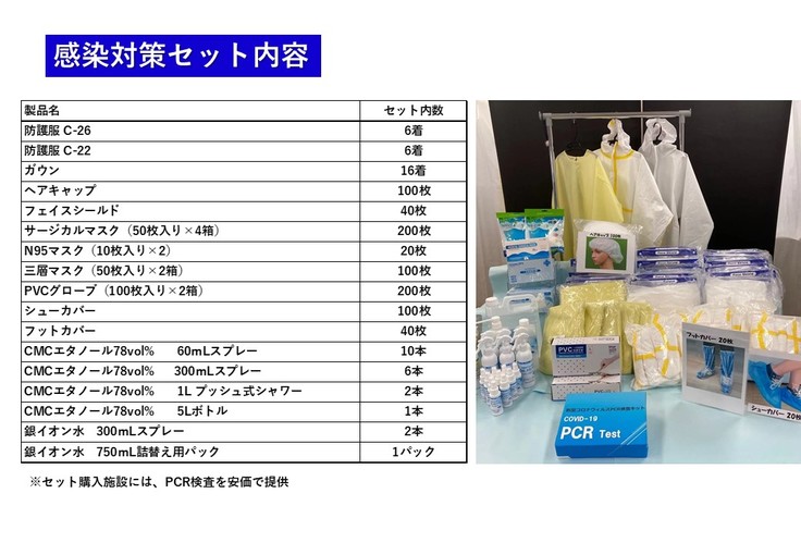 定価15万円の感染予防品セットを5万円で介護施設に提供するために、1セット5万円×20セット分として総額100万円の支援をお願いします。