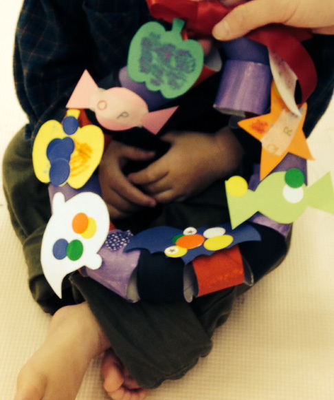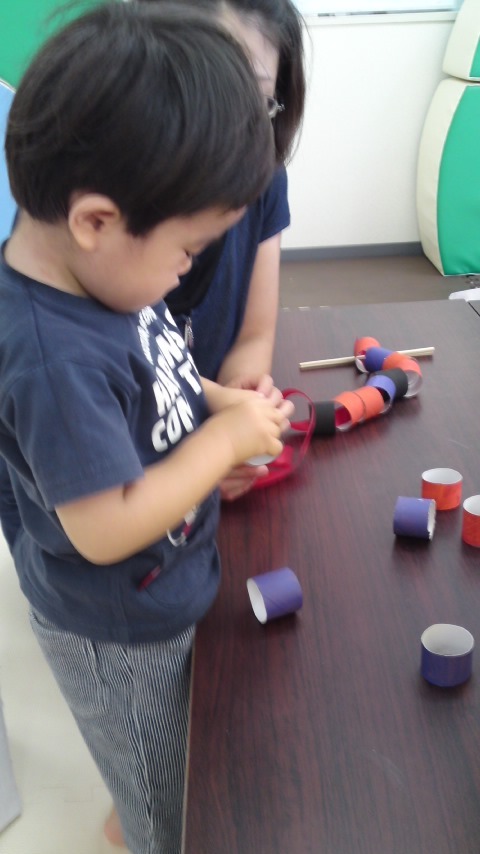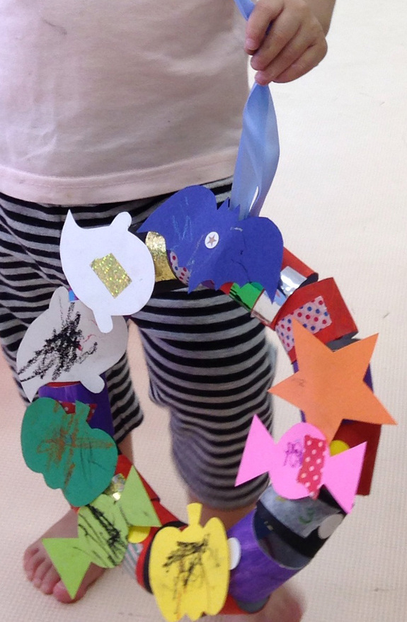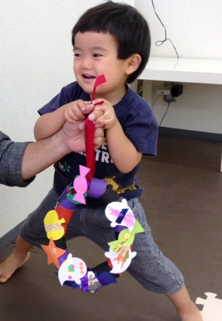 リボンにわっかを一つずつ通したり、クレヨンやシール、で飾り付けをしました。