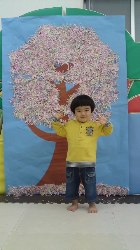 赤ちゃんアートでは赤や黄色、緑の紙で大きな木を彩りました。