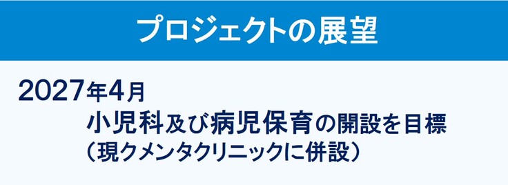 2024年4月に小児科と付随する病児保育を開設します。小児科医、看護師、保育士など各種専門職の人材を確保。現在のクメンタクリニックの拡張工事。人材確保や工事費や小児科用の医療機器などの設備投資に対して資金を利用します。