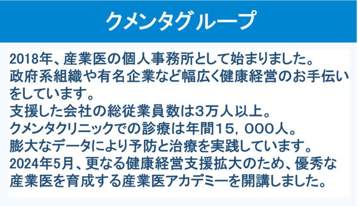 産業医アカデミーを開設し、後進の育成に当たっており、今後久米が直接顧問として担当することは困難です。