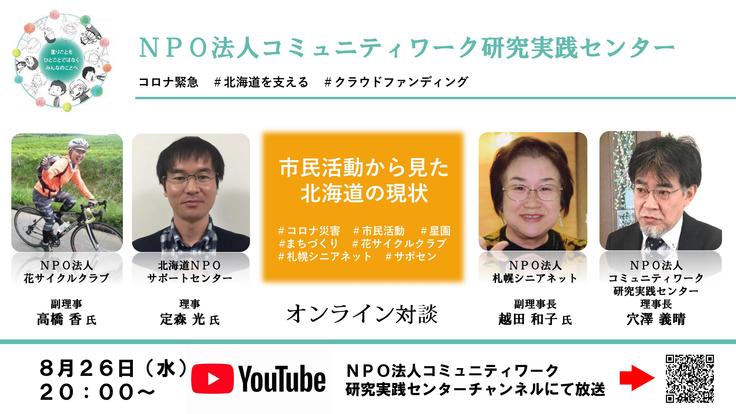 8月26日(水)20時から穴澤理事長とのオンライン緊急対談の第4弾を配信します。第4回目のテーマは「市民活動」です。人が集まることが難しくなったコロナ禍で、様々な活動に影響が出初めています。