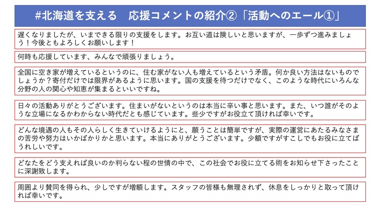 北海道にお住まいの、もしくは出身・ゆかりのある皆様からのメッセージです。同じ、道民・道産子として、凄く心強く思います。