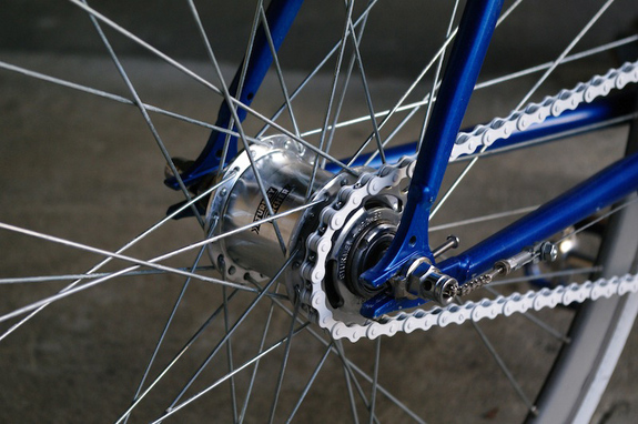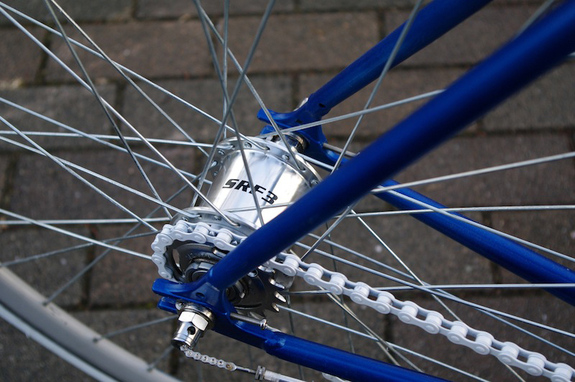 見た目はシングルギアそのもので美観をそこねません。しかしギアのシステムが内部に組み込まれ、しっかりとギアの働きをしてくれます。モデルは内装ギアの生みの親STURMEY ARCHER社のSRF3です。シフトレバーもクラシカルでシンプルなシフトレバーを採用しました。(ギアセット...本体価格+6800円)