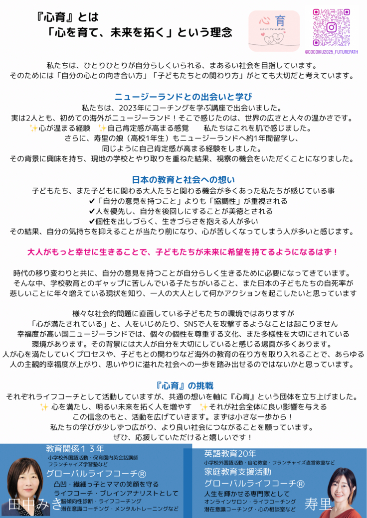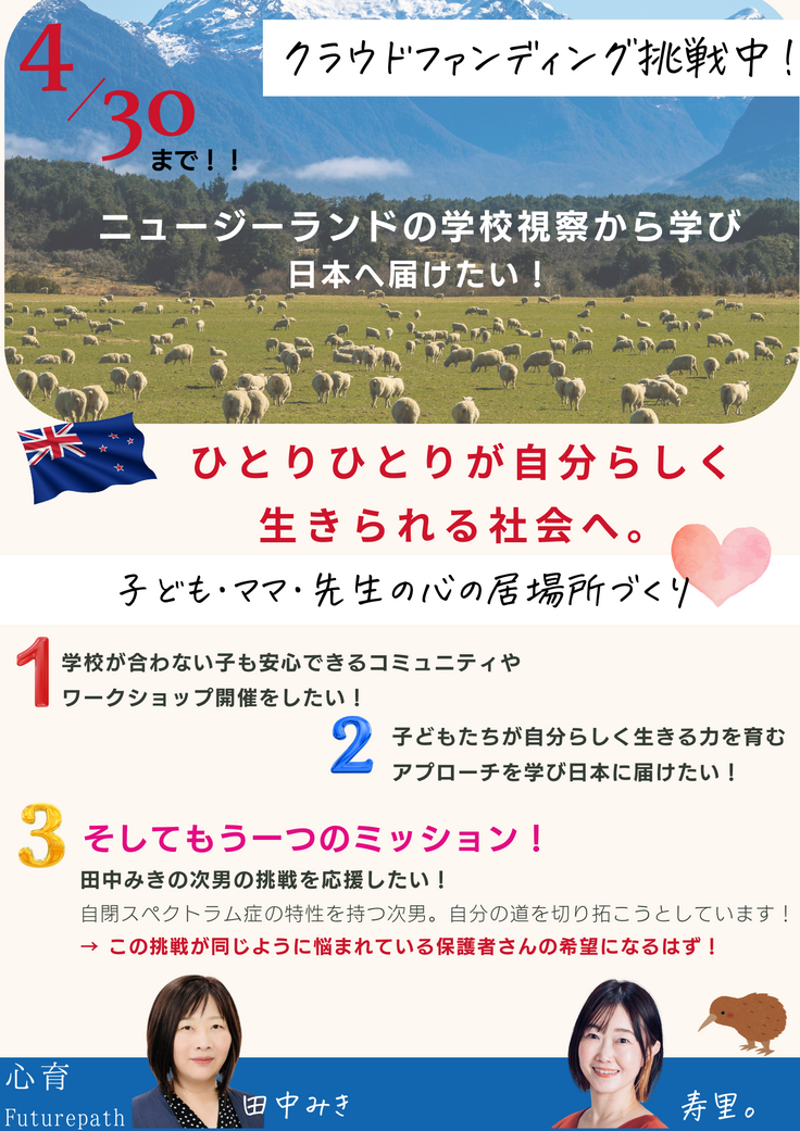 ひとりひとりの個性を輝かせられる未来の実現に向けて、‘心を育て未来を拓く‘をコンセプトに結成した『心育 Futurepath』が、2025年8月にニュージーランド学校視察や現地の方々との交流を通じて、インクルーシブ・心の向き合い方の新たな視点を持ち帰り今後の活動に役立てます。その渡航費・滞在費などのご支援をお願いしたいです。支援金の使途は、渡航するメンバーの国際線800000円・日本国内移動費160000円・現地国内移動費200000円、現地宿泊費280000円、学校への謝礼30000円、現地の方々への土産(謝礼)30000円 と見積もっています。どうぞよろしくお願いいたします。