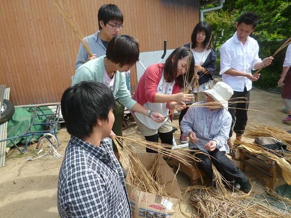 (島の伝統である縄なえを通した学生と島民との交流)