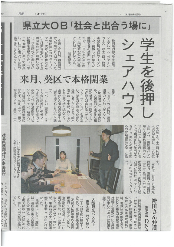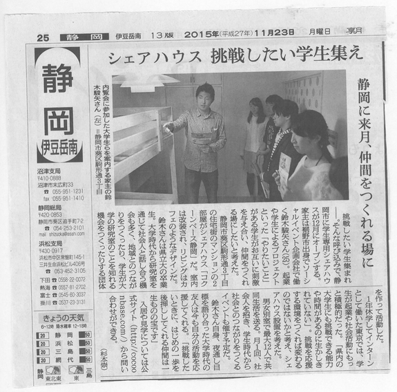 静岡初の学生専用シェアハウスということで、コクーンベース静岡の取り組みをさまざまなメディアで取り上げていただきました。