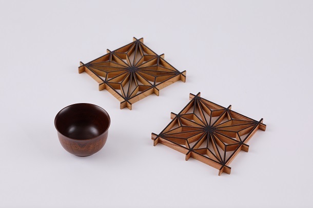 漆の器と香椿(欅)の組子コースター(赤っぽい手前が香椿、奥が欅)