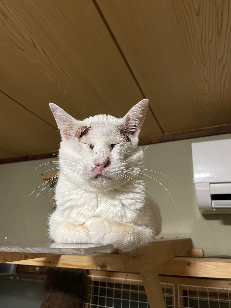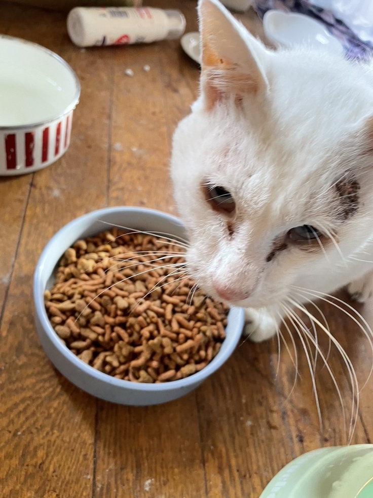 じいは、慢性腎不全の他にエイズ、そして顔に「謎のかさぶた」があるものの、ご飯が大好きです。
