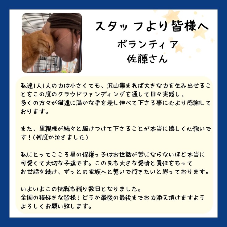 保護っこ達を大切に想ってくださり、一緒に頑張ってくれることがとても心強く、私たち姉妹は何度も助けられてきました。
