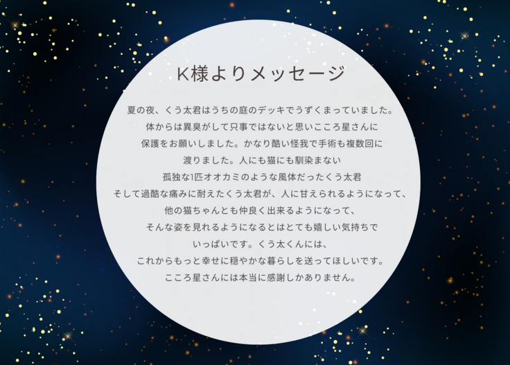 お二人が医療費をご負担してくださったお陰で、くう太に最善の医療をかけることができました。