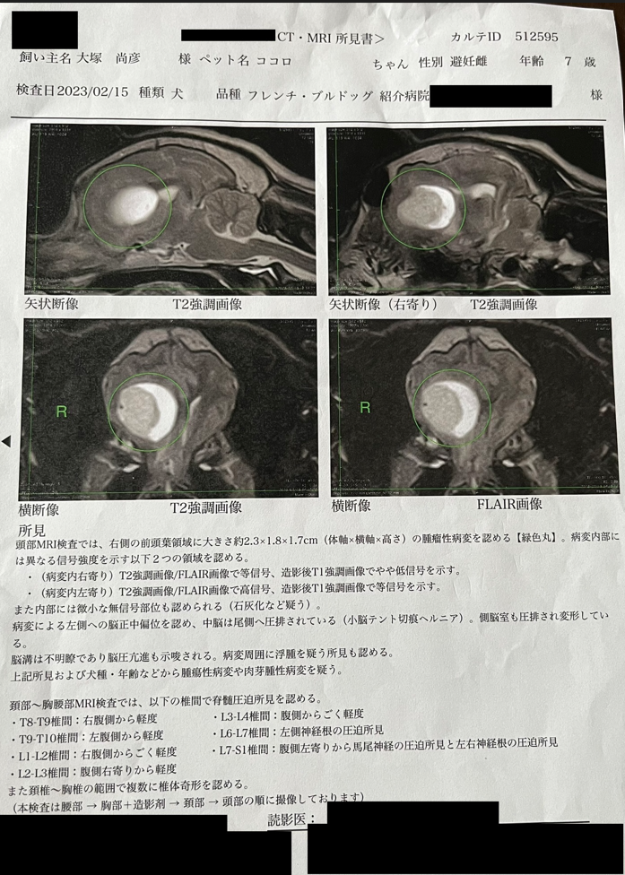 脳腫瘍の可能性を指摘され、その後の大学病院で脳腫瘍の診断を受けました。