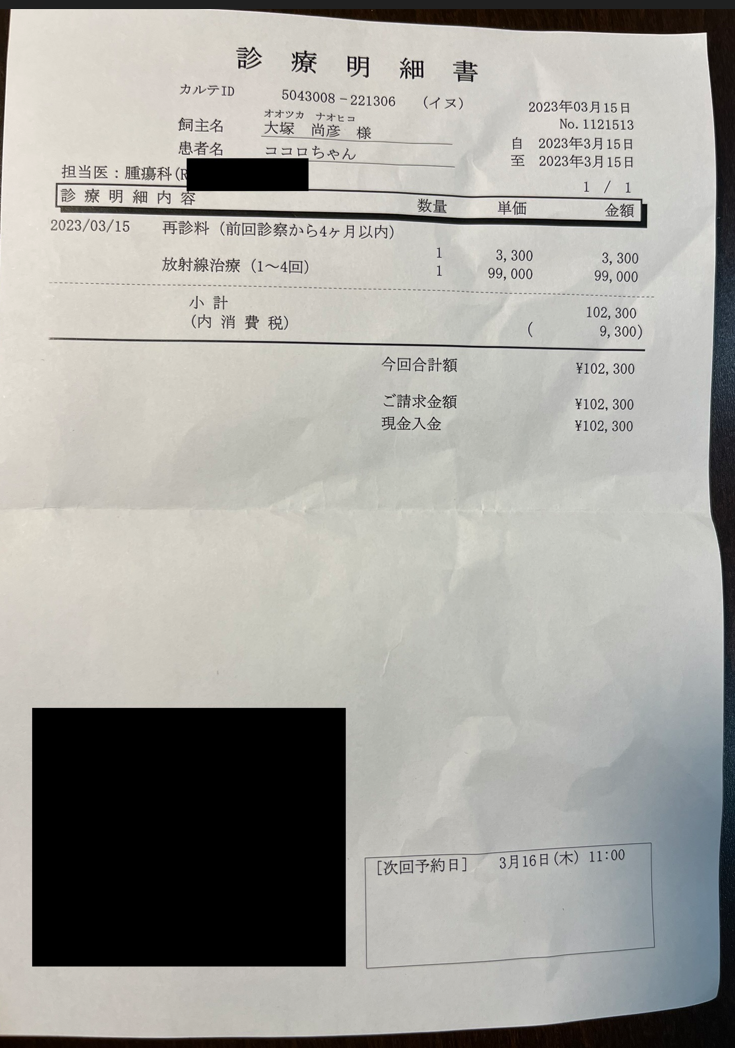 ■放射線治療費用(13回):891,000円(99,000x4回 + 55,000x9回) ■検査費用、内服薬、注射:207,720円 ■通院費:12,480円 ■治療後の検査代、薬代:現時点では正確な金額は分かりません ■ReadyFor手数料(12%)+消費税(10%):125,400円 ■ココロの放射線治療費、検査代、その他交通費等に大切に使用させて頂きます。 残念ながら放射線治療でも再発のリスクがあるため、将来的に対処療法が必要になった際にもありがたく使わせていただきます。