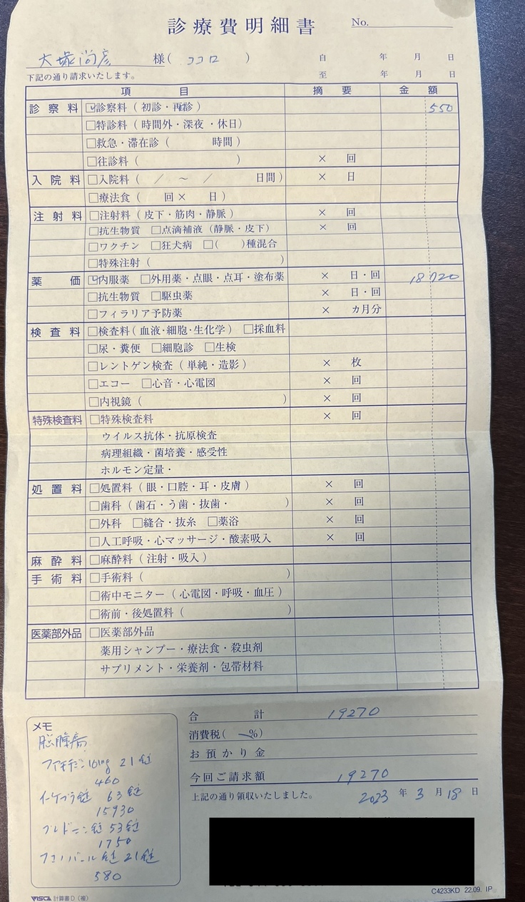 ・治療後の検査代、薬代:現時点では正確な金額は分かりません