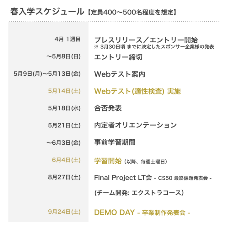 4月上旬〜5月8日 にかけて、エントリー期間を設け、一定の選考を経て入校希望される方に対し、 毎週土曜日の 10:00〜19:00 の時間帯に、約16週間にわたってプログラミング教育のカリキュラムを無償かつ非営利で提供します。 資金使途は、入校された数百名規模の学生に対しプログラミング教育を実施するための、人件費、教材費、運営コストとなります。春入校、秋入校と2回のエントリー機会があり、今回のクラウドファンディングは、「春入校のプロジェクト実施分」のためのものになります。 ●参加する学生に別途発生する費用 メインのカリキュラムは無償提供されますが、推奨図書として事前学習用1冊を含む、講義の中で推薦された書籍を学生が自ら購入する場合、本の購入費用として2,000円〜数千円程度の範囲内での本人の実費負担があります。また、Harvard CS50x の認定を受ける場合、履修証明書の取得に200ドルの支払いが必要となります(卒業された方のみ発生) ●その他注記事項 本プロジェクトにあたって、入校時にデポジット金として1万円を支払い、退校時または卒業時に全額が返還される仕組みをとっておりま