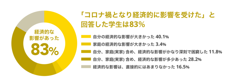 ▼自身または家庭において、経済的な影響があったと回答した学生は 83%