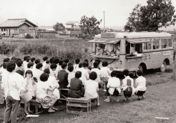 テレビ、チラシ、インターネットなどない時代の宣伝カーでした。ロバのパン屋さんの移動販売車の音楽が聴こえると子供たちが集まってきたように、ポン!ポン!とポン菓子のはぜる音が聴こえると、紙芝居のおじちゃんのところに子供たちが集まってきたように。